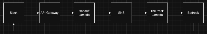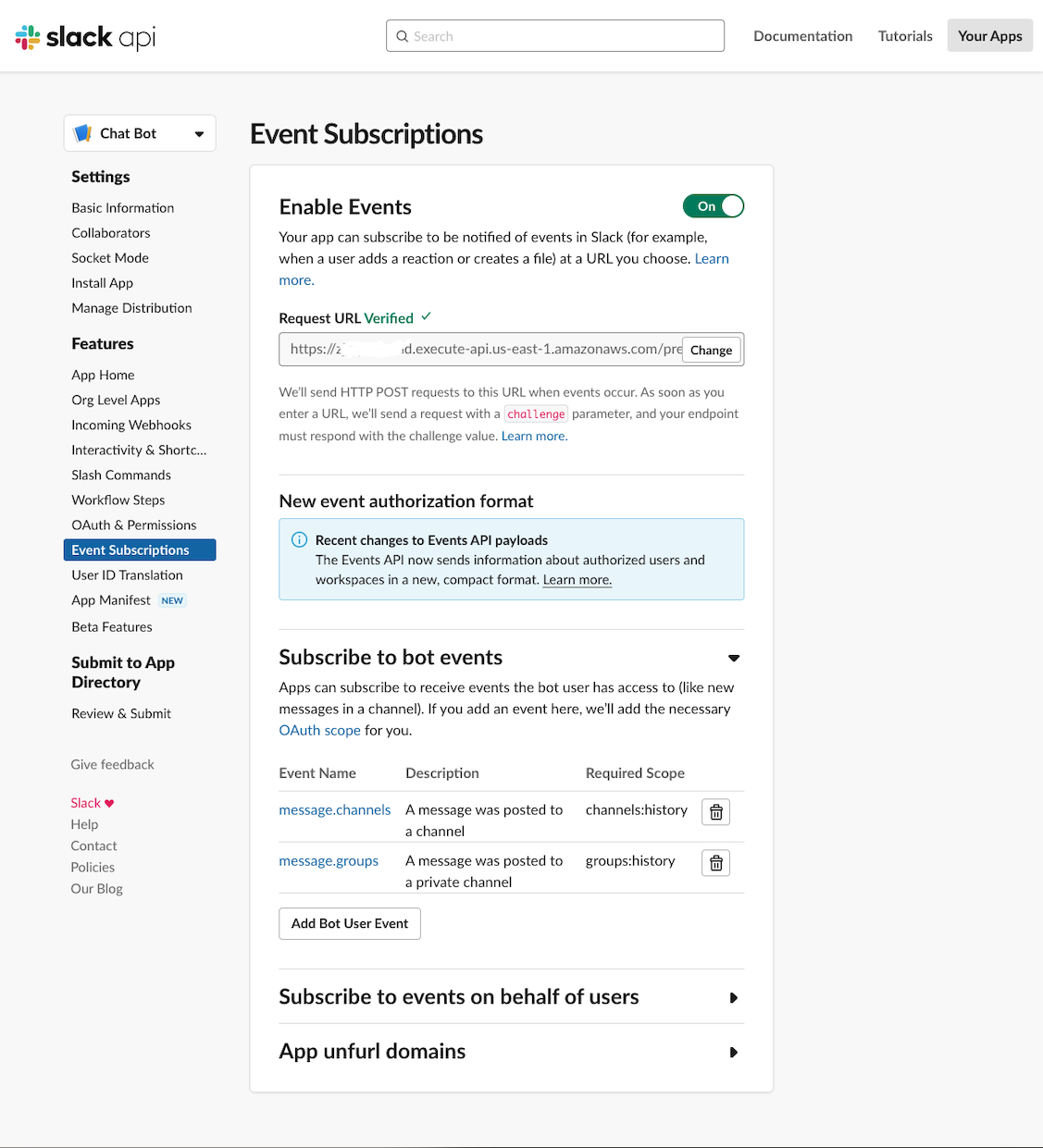 OAuth & Permissionschannels:history, channels:join, chat:write, metadata.message:readgroups:historyapp_mentions:readEvent Subscriptions so your bot will receive your chat messagesEvent Subscriptions on the left nav panelEnable Events toggleyarn serverless deploy into the "Requested URL" fieldSubscribe to bot eventsmessage.channels and message.groupsInstall App on the left nav panelBot User OAuth Token, add it as an environment variable in your API: process.env.SLACK_TOKENNow go to Slack, create a channel, add your bot, and ask it all sorts of vague questions about your knowledge base.